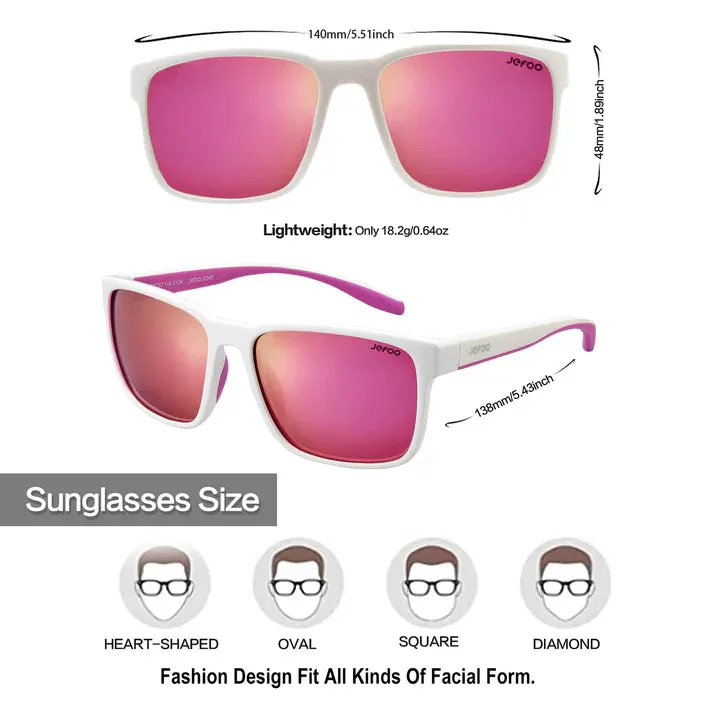 These sunglasses feature a mirrored pink with purple tone and subtle yellowish hues, providing a stylish look when you are wearing. The combination of pink and purple tones adds a unique touch, making these sunnies a fashionable yet functional choice for outdoor recreation enthusiasts and daily wearers alike. Equipped with TAC polarized lenses, these shades are also crafted to reduce glare and shield your eyes.