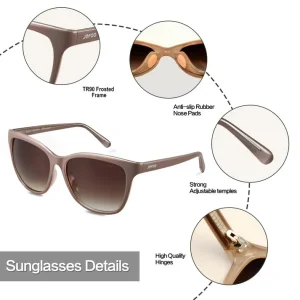 Blyzeo Apricot Gray low-key cat eye sunglasses embody a nuanced elegance with their delicate apricot tone frames, accentuated by the soft touch of milk tea gray hue. Inviting a warm feeling, the gradient brown polarized lenses, protect your eyes from UV rays. Crafted from lightweight TR90 material frames, these sunnies are not just for daily outwork but for shooting moments. With lightweight and flexible adjustable temple tips, they ensure a fit as comfortable as a butterfly touching a flower. Styling for the urban landscape, these sunglasses stand out, capturing the subtle charm of the apricot bloom, and company you promenade through both shaded lanes and sunlit streets.
